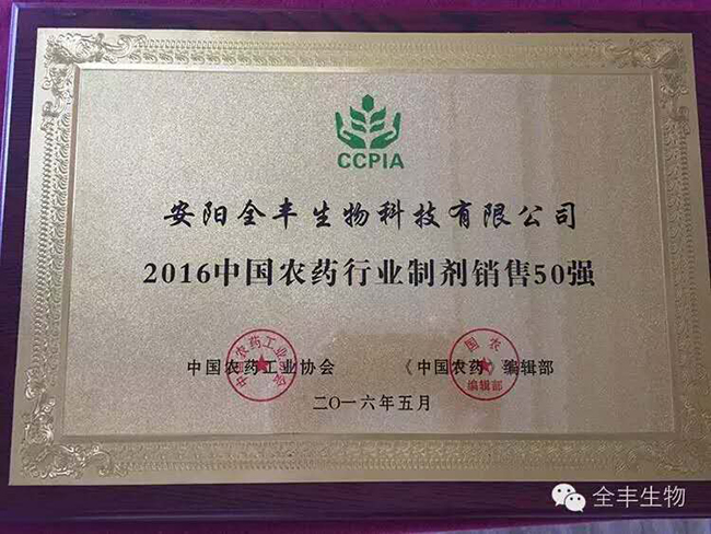 安陽全豐生物科技有限公司以“誠潤田園、豐達天下”為崇高使命,“全心服務、豐收萬家”為不懈追求。始終堅持質(zhì)量第一、服務第一的理念,榮獲中國制劑銷售50強企業(yè),榜單排名第三十七位!