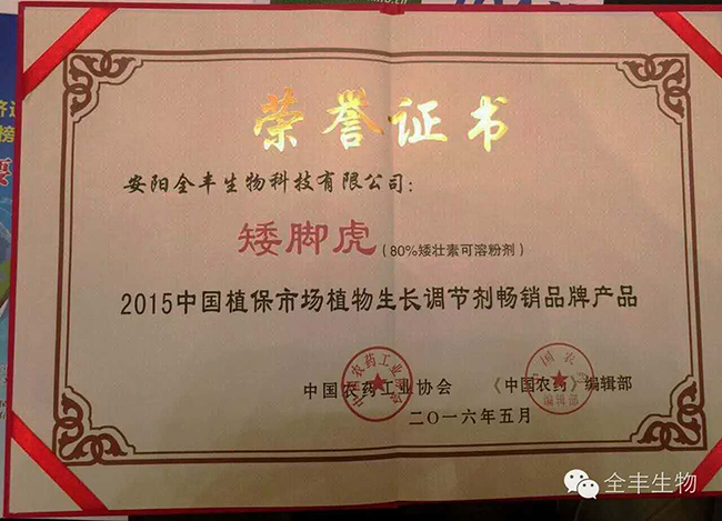 同時,安陽全豐“矮腳虎?” 榮獲2015年中國植保市場植物生長調(diào)節(jié)劑暢銷品牌產(chǎn)品!