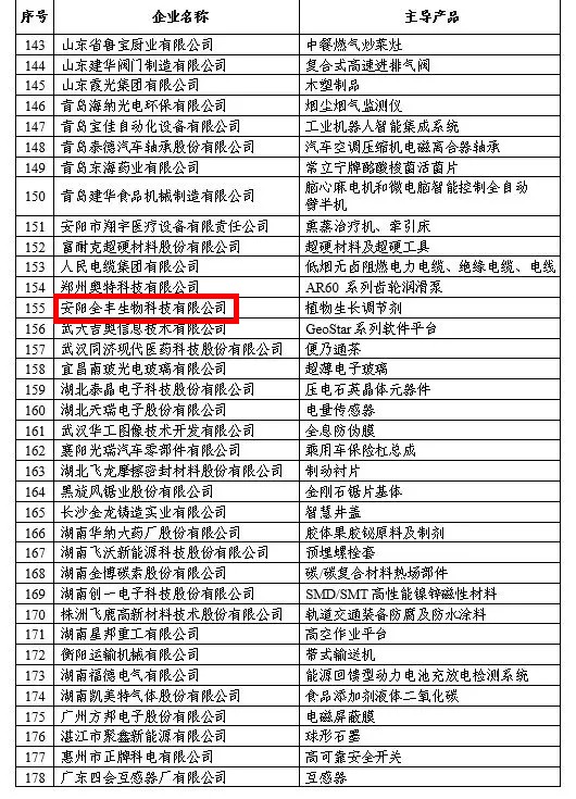 其中,河南有5家公司入選,分別是安陽全豐生物科技有限公司、富耐克超硬材料股份有限公司、人民電纜集團有限公司、鄭州奧特科技有限公司和安陽市翔宇醫(yī)療設備有限責任公司。